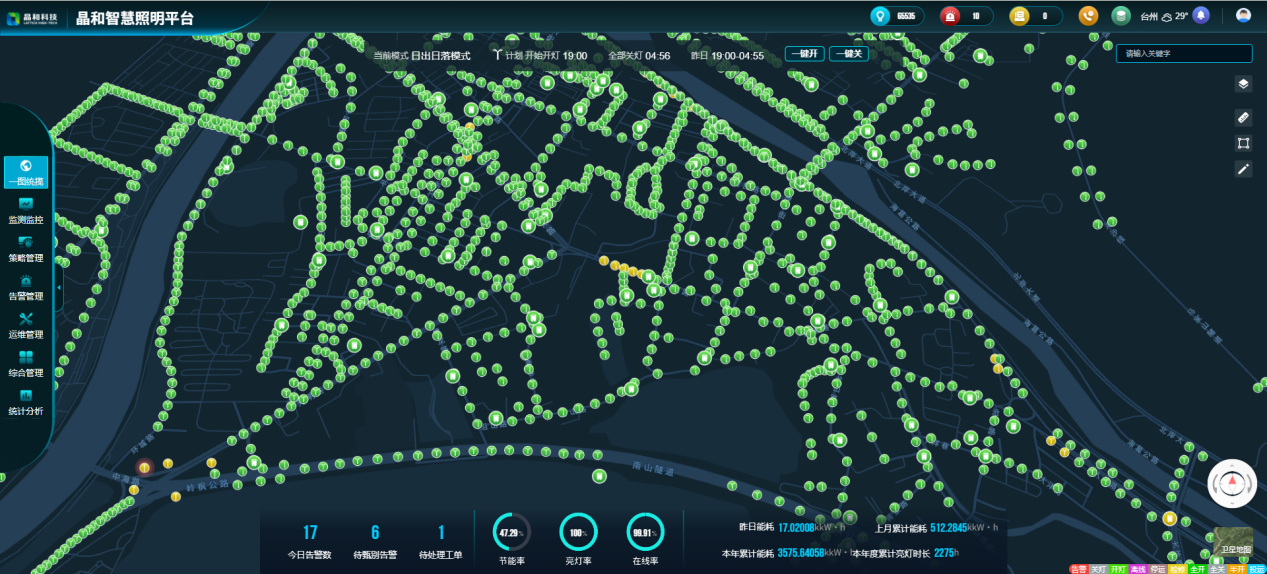 晶和科技基于自主研发的城市智慧照明管理平台,通过运用NB-Iot、4Gcat.1等先进技术,将LED照明灯具接入平台系统,实现远程灯光控制、城市照明一图统览、监控监测、策略管理、告警管理、运维管理等功能,做到按需照明和精细化管理,提高城市照明运行的可靠性与响应速度,点亮数字城市建设的“节能之路”。